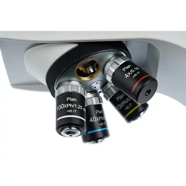 - 3 Объективы фазовые планахроматические, скорректированные на бесконечность: 4x, 10x, 40xs, 100xs (масляный) с антигрибковым покрытием