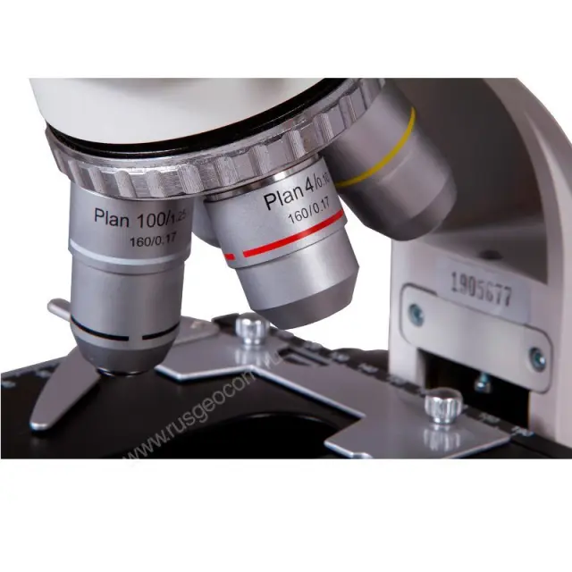 - 3 Объективы планахроматические: 4х, 10х, 40xs, 100хs (масляный) с антигрибковым покрытием