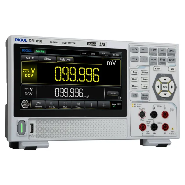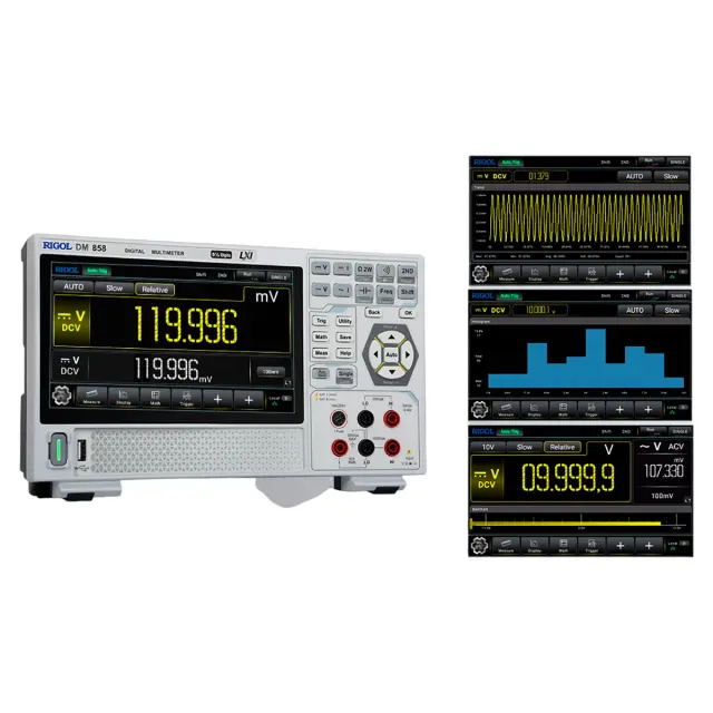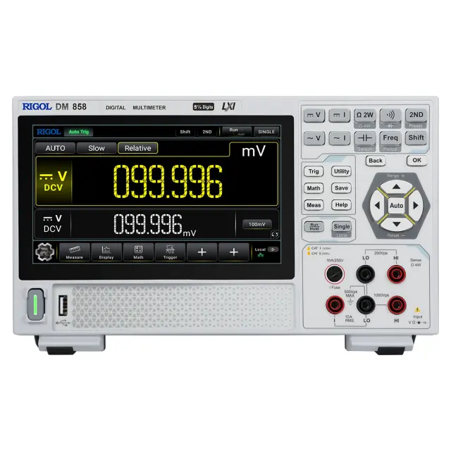 Оборудование поддерживает режим True-RMS, а также снабжено аналоговым фильтром, обеспечивая получение точных показаний при измерении переменного напряжения номиналом до 1000 В и силы тока до 10 А в полосе пропускания до 8 кГц при искажении синусоидальной формы сигнала вследствие влияния реактивных нагрузок и воздействия частотных помех и гармоник. Реализована возможность измерения емкости до 10 мФ, частоты до 100 кГц, сопротивления до 100 МОм по 2- и 4-линейной схеме, контроль исправности диодов и целостности электрических цепей. Также мультиметр RIGOL DM858 способен отслеживать физические параметры разных объектов с помощью подключаемых датчиков температуры, давления, расхода и пр., для чего предустановленно 10 стандартных конфигураций и поддерживается компенсация холодного конца термопары.