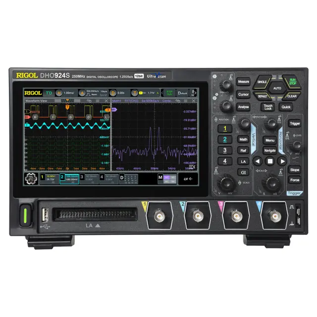 Цифровой осциллограф RIGOL DHO924S относится к семейству экономичных лабораторных устройств на основе 12-битного АЦП, сочетающих в себе высокую производительность и компактный размер. Помимо 4 аналоговых входов с полосой пропускания 250 МГц, прибор оснащен 16 цифровыми каналами, поддерживая возможность работы со смешанными сигналами при подключении опционального логического пробника, а также встроенным генератором. В этой модели стандартно реализованы функции записи и воспроизведения осциллограмм, декодирования протоколов 6 основных типов, математической обработки данных, включая БПФ, построения фигур Лиссажу и графиков Боде, анализа гистограмм, тестирования по маске и т.д.