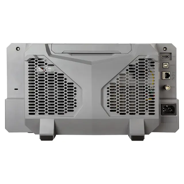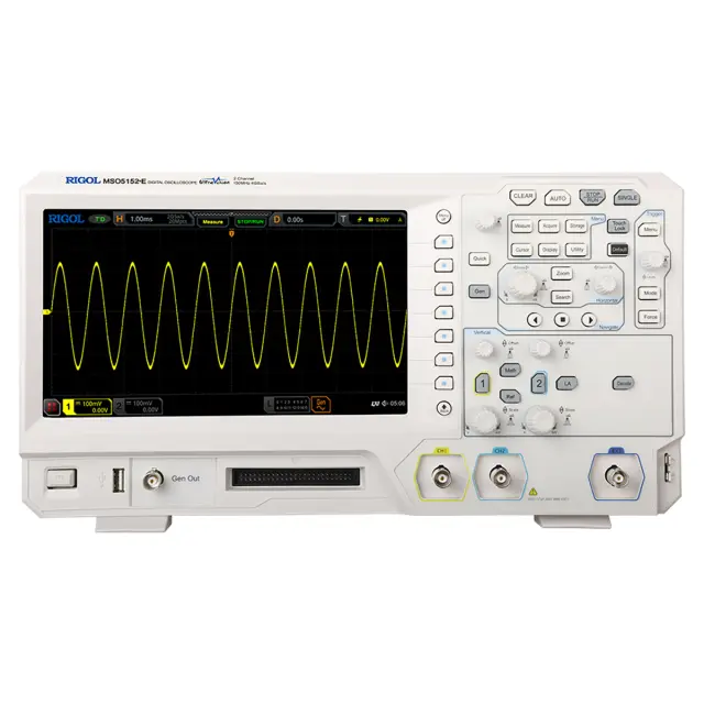 Полоса пропускания в 150 МГц обеспечивает возможность диагностики и наладки разнотипных бытовых приборов и устройств, акустических систем, радиооборудования и т.п. Модель снабжена встроенным цифровым вольтметром с режимом TRMS, для которого можно задавать пороговые значения для ускорения проверки соответствия контролируемых параметров норме, а также прецизионным частотомером с сумматором, реализующим функцию сбора статистики. Поддерживается функция запуска и декодирования последовательных шин. Наличие режима БФП с расширенным перечнем оконных функций позволяет выполнять углубленный анализ спектра сигналов. При доукомплектовании цифровым 16-канальным пробником осциллограф Rigol MSO5152-E можно использовать в режиме логического анализатора. Опционально прибор может быть оснащен функцией анализа мощности для тестирования источников питания и внутренним генератором, позволяя обходиться без внешнего источника тестового сигнала.