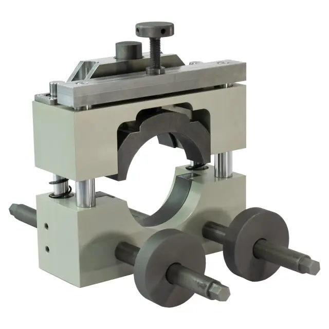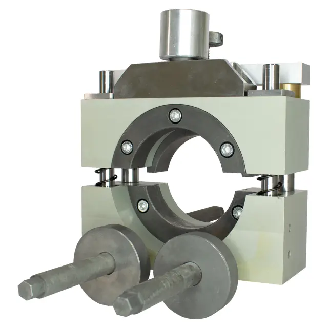 Для исключения люфтов подвижной части приспособления относительно неподвижной и обеспечения параллельности рабочих поверхностей рамочная конструкция оборудована 4 направляющими. Фиксация цилиндрического образца производится с помощью винтового зажима. Возвращение верхней части изделия в исходное положение после испытаний обеспечивает пружинный механизм.